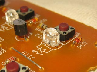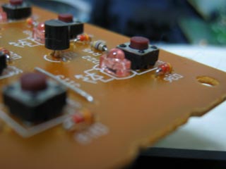 新しいLEDをスイッチボードに取り付けた写真です。タクトスイッチよりも高くなってしまいましたが、果たしてボタンと干渉しないでしょうか?結果はOKでした。
