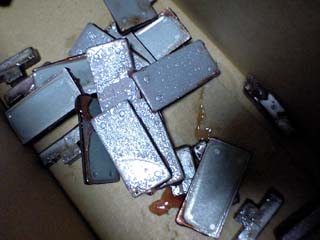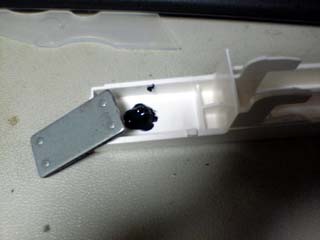 いきなりグロっぽい画像ですが、これが外したJV-1000の錘です。平べったいのが白鍵、「ト」形をしているのが黒鍵に付いていた物です。 この赤い接着剤がJV-1000の錘落ちの原因なのですね。JP-8000に取り付けるためにはこの接着剤を取り除かなければなりません。シンナーやアルコールではこの接着剤は溶けませんでした。なので、錘をペンチで掴んでカセットコンロで熱し、接着剤が柔らかくなったところをティッシュペーパーで拭き取るという地道な作業を行いました。 |