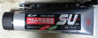 悪名高き(?)初期JV-1000の接着剤に代わり、新しく錘をキートップに固定するために選んだのはこのボンドSUです。金属、プラスチック共に使用でき、ゴム系なので硬化後も弾力性があります。 |