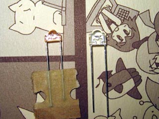 元々スイッチボードに取り付けられたLEDは、恐らく松下のLNJ801LPDJAでしょう。足の間隔が通常の2.5mmではなく5.0mmであるうえに丸形ではなく低背の変形です。 |