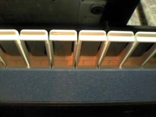 上から見たところです。 ちょっと分かりづらいですが、鍵盤奥とトップパネルの間に青いフェルトが見えます。単に見栄えだけのものですが、ひょっとしたら防塵効果があるかもしれません |