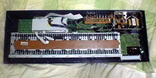 JP-8000の底板を外したところです。ノブやレバーを破損させないよう、布団の上で分解をしました。キースキャン用のフラットケーブルを外します。 |