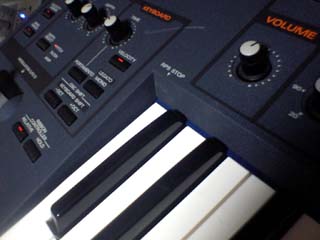 こちらはピッチベンドレバー付近の写真です。本当に見やすくなったかどうかは、今後のライブ会場で使ってみないと分かりません。根本的に解決するには、着色されていない透明なボタンに交換することですが、こればかりはどうしようもありません。 |
